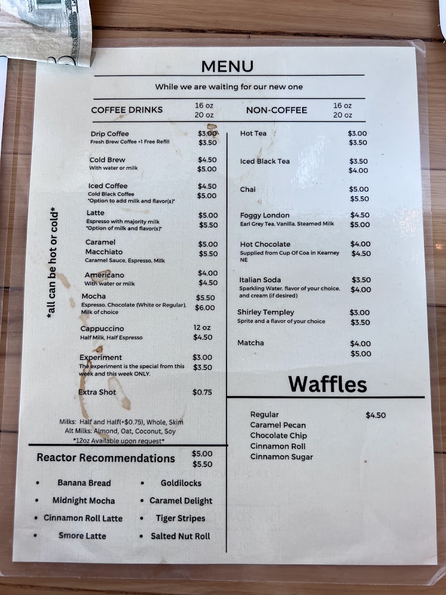 The Reactor Recommendations section highlights some of the best choices at the café. Whether you're indulging in the Banana Bread, the velvety Midnight Mocha, or the warmly spiced Cinnamon Roll Latte, these selections showcase the café's signature flavors. For a s’more-inspired treat, the Smore Latte is a great pick, while the Goldilocks drink continues to stand out as a unique specialty.